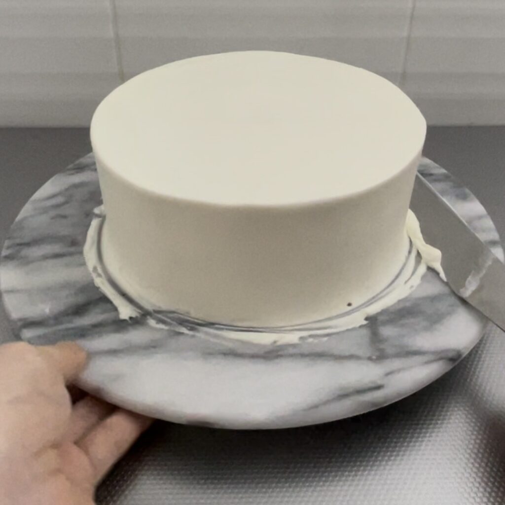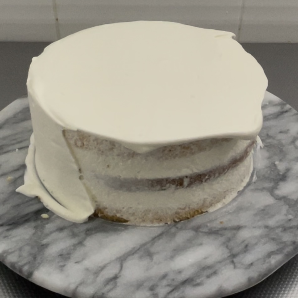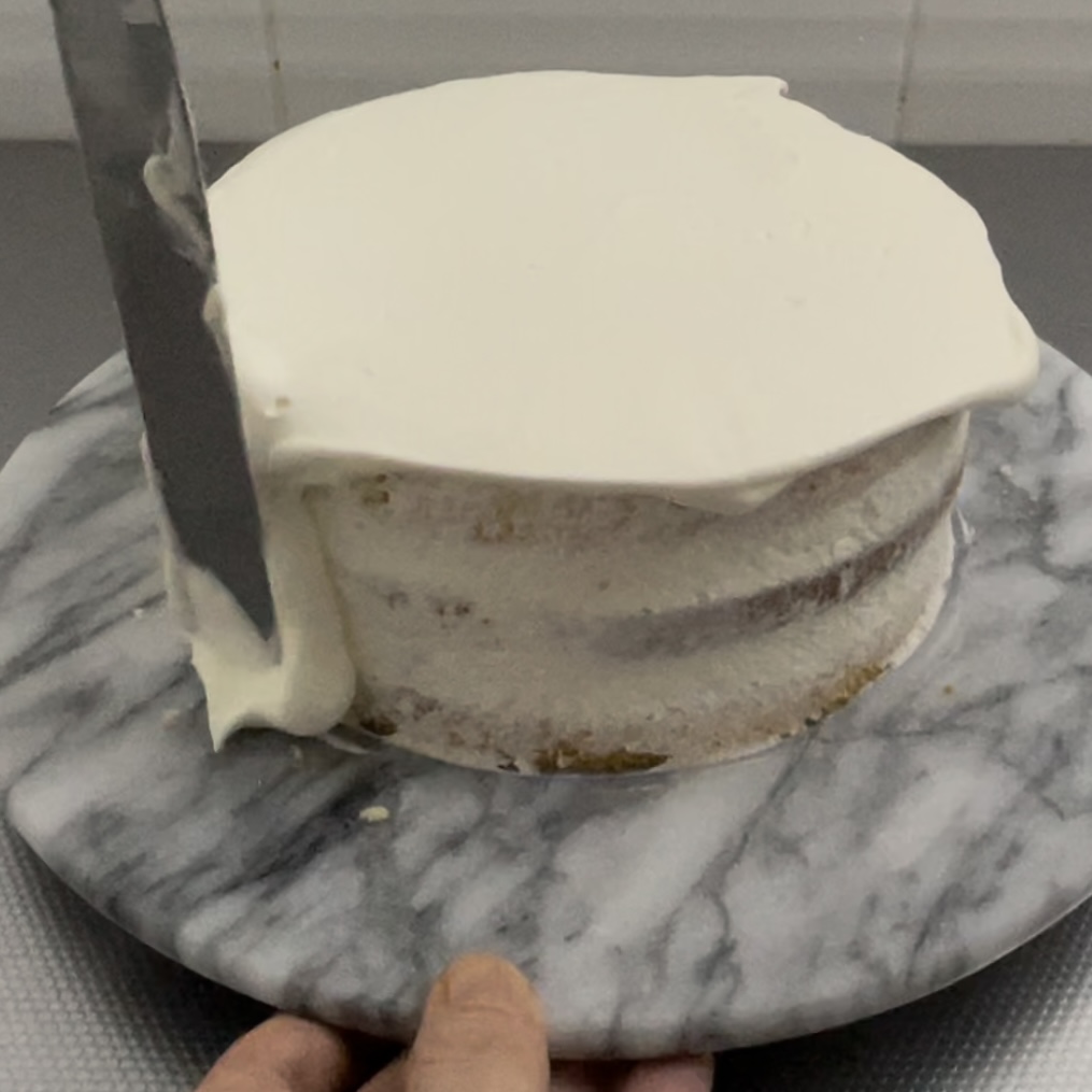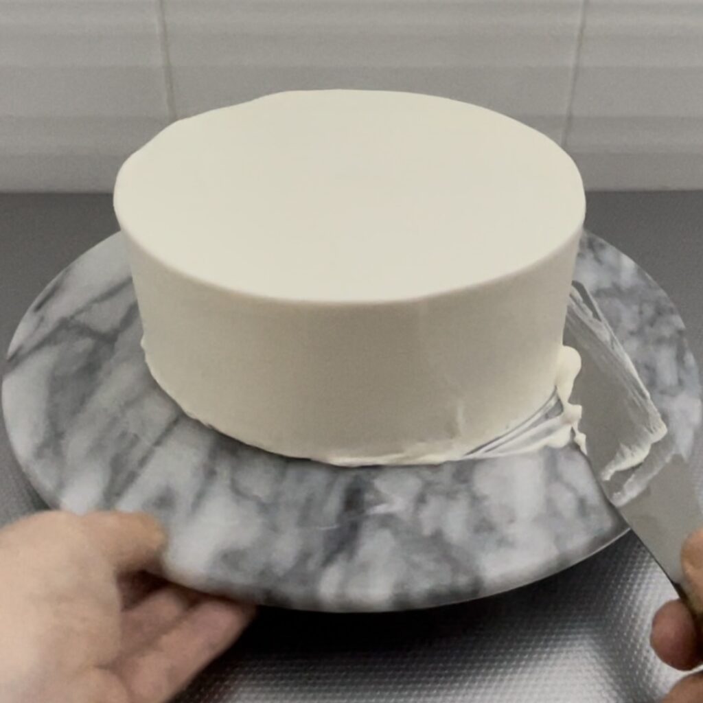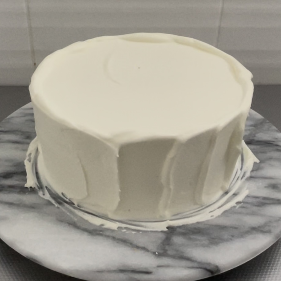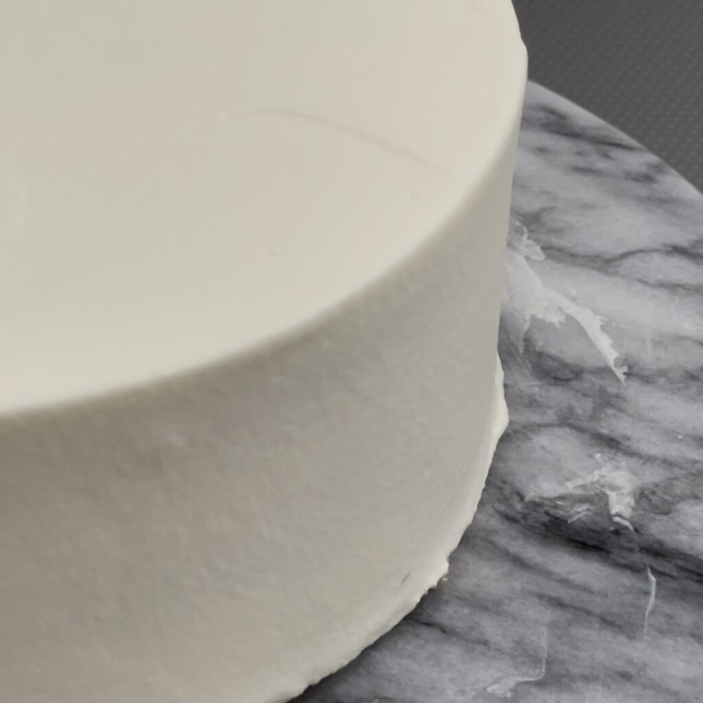 仕上げのクリームの状態が見た目の綺麗さに直結するので、仕上げ塗りに失敗してボソボソになってしまったら、一度冷蔵庫で固めて緩いクリームで再度薄くナッペすると綺麗に見えます。