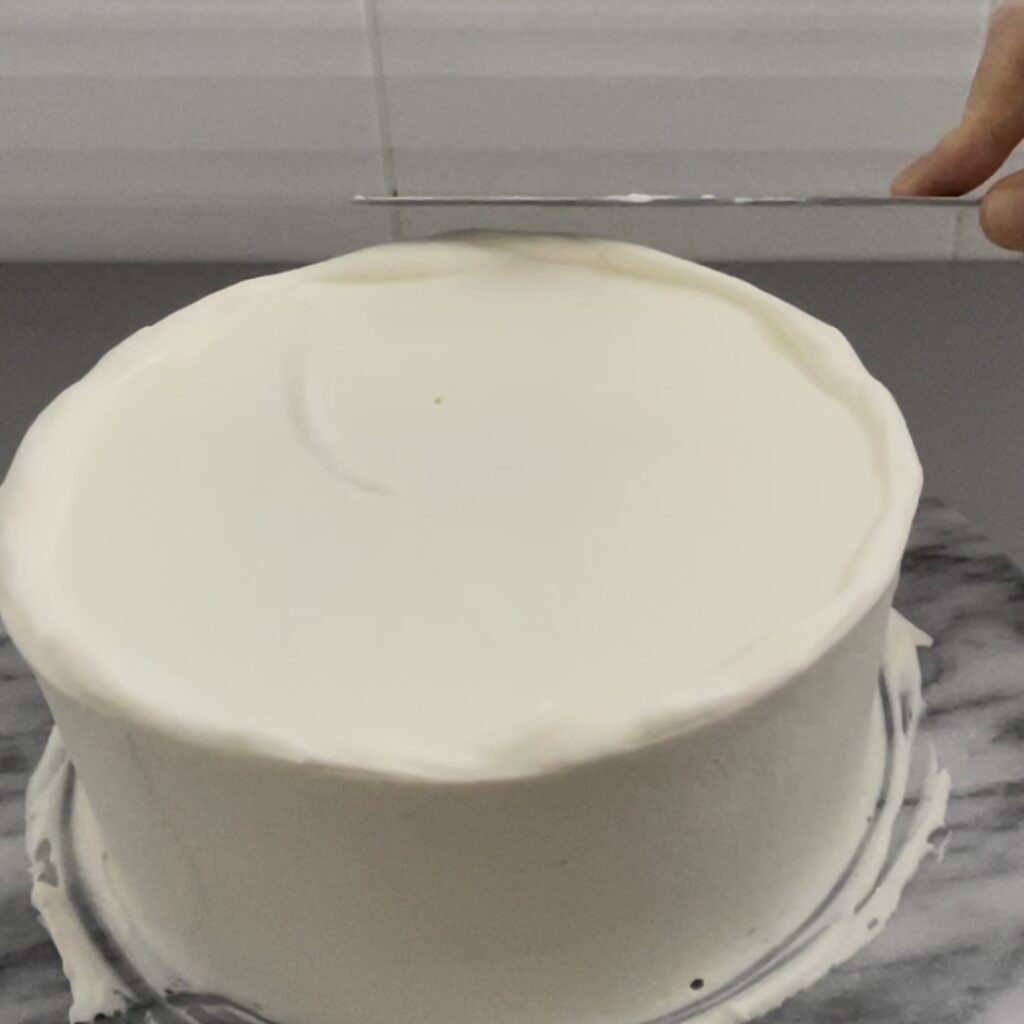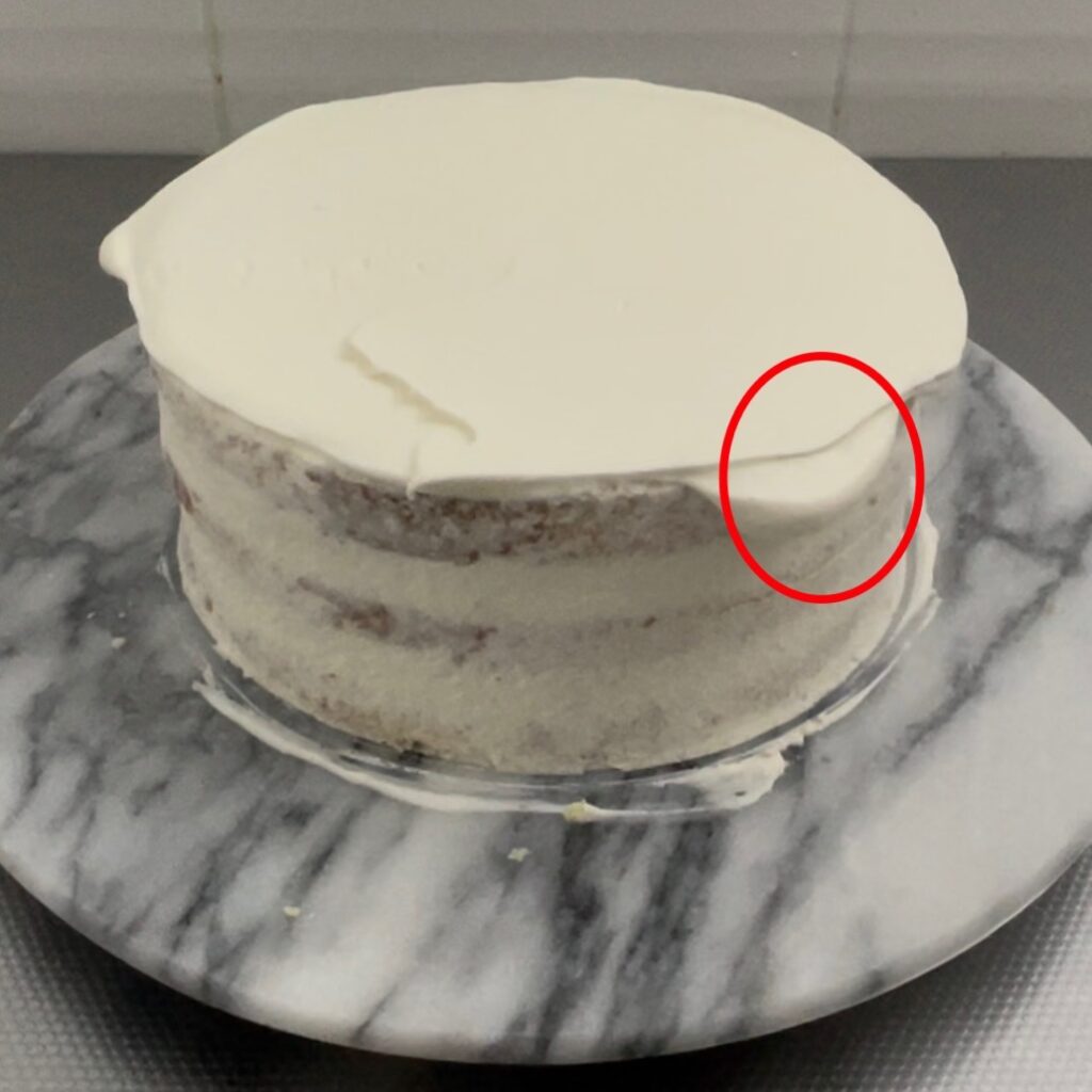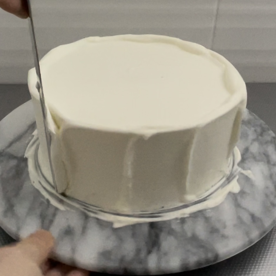 天面からはみ出ているクリームが側面に流れるほど多い場合は、クリームの付いていないパレットナイフで、そのはみ出ているクリームを側面に塗りつけます。