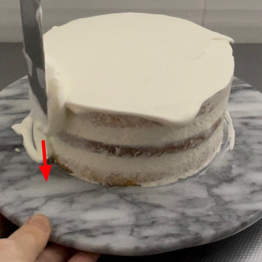 パレットナイフを貼り付ける時に、ケーキの底より少し上に一度パレットナイフを当て、そのままナイフの先が回転台に着くように下ろします。