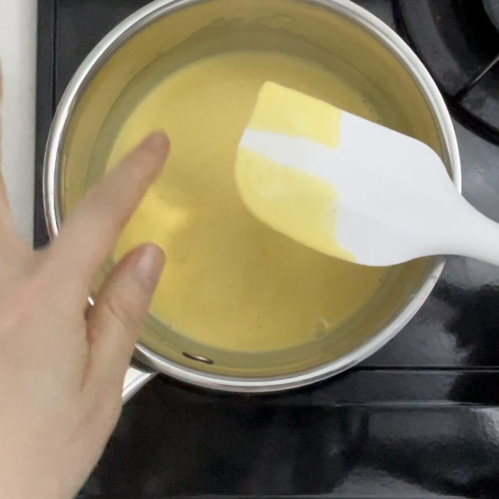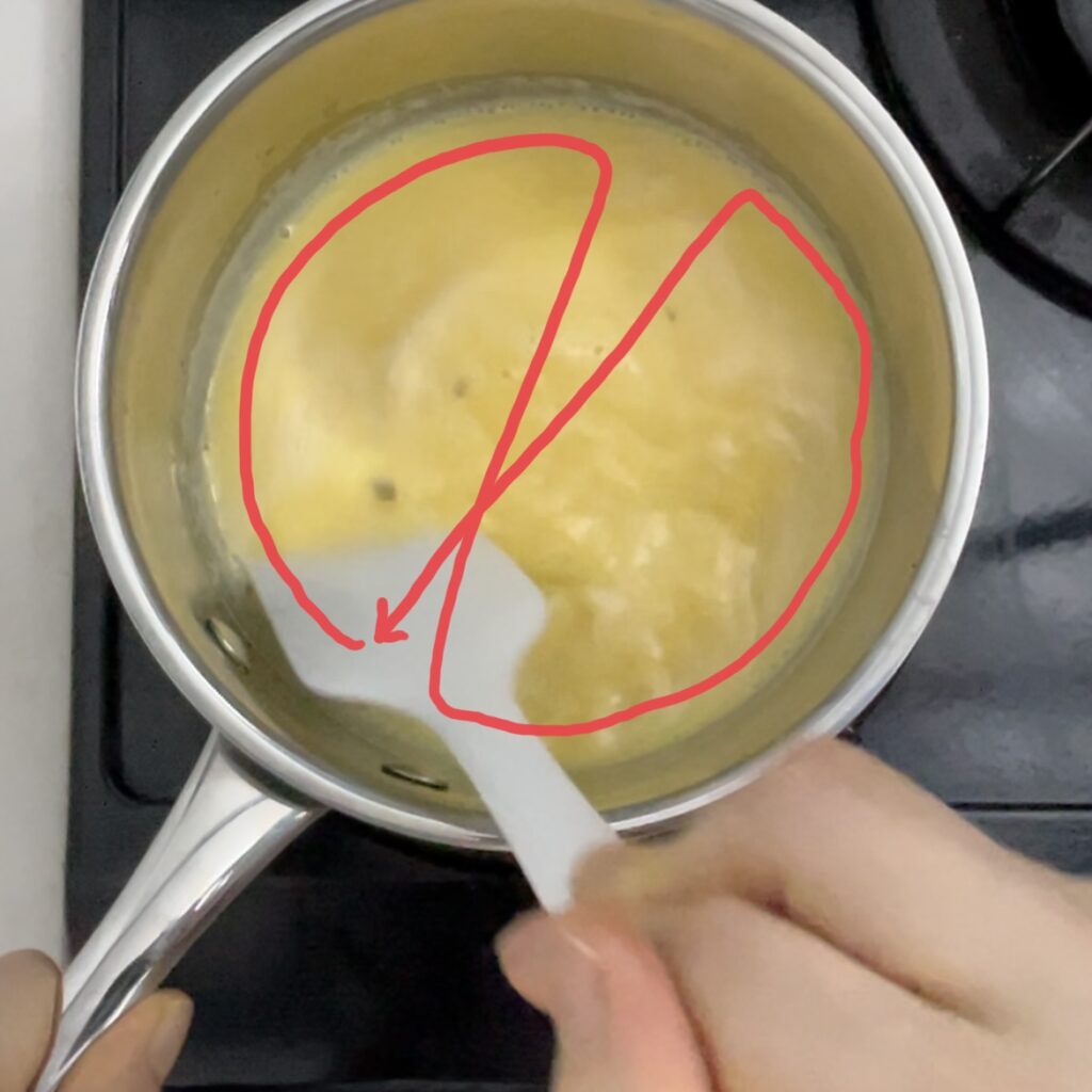弱火にかけ、絶えず鍋底をゴムベラでこするように矢印のように混ぜて、常に液体が動いている状態にします。