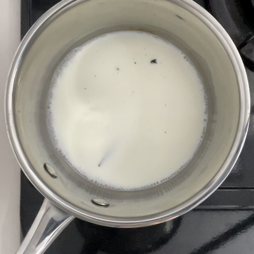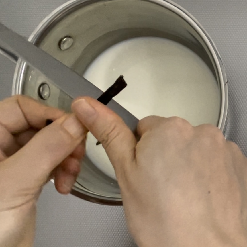 バニラはさやに香りがあるので、さやも牛乳に入れます。
