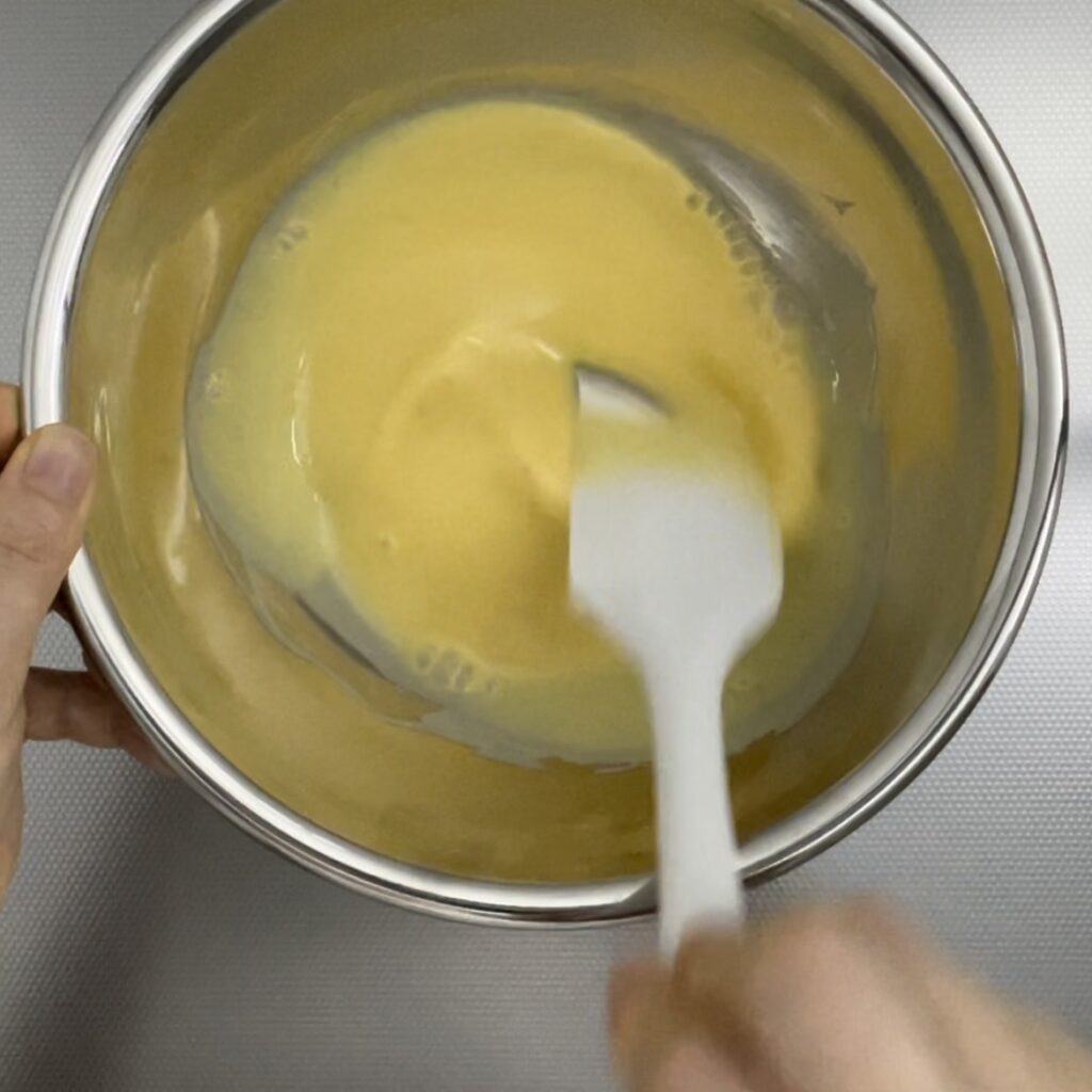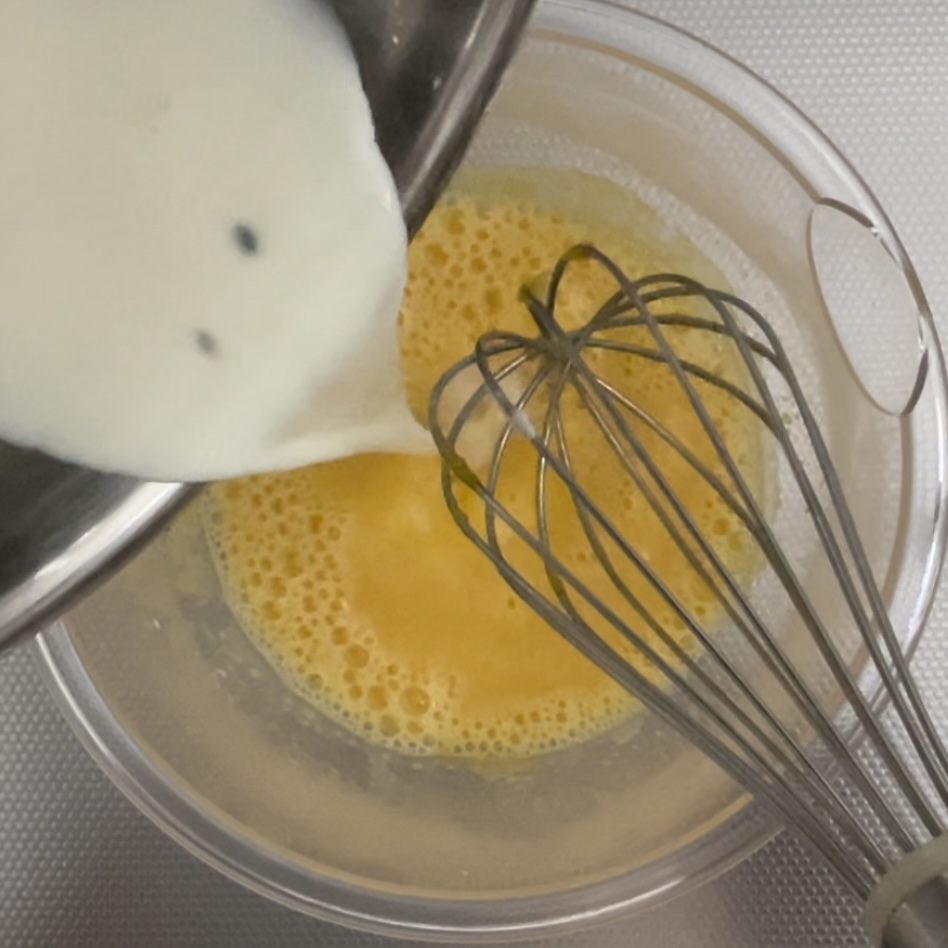 始めから一気に全量入れるよりも、一部でときのばしてから残りを入れた方が卵黄が固まりにくいです。