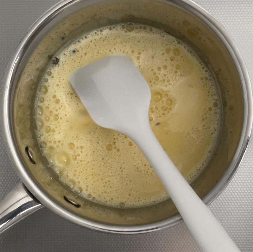 だからと言って温度が低すぎると、後で卵黄と加熱するときに時間がかかってしまうので、膜が張らない程度までなるべく温度を上げます。