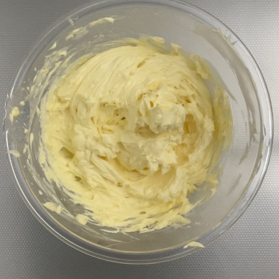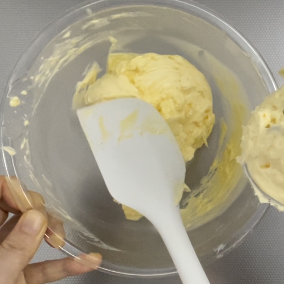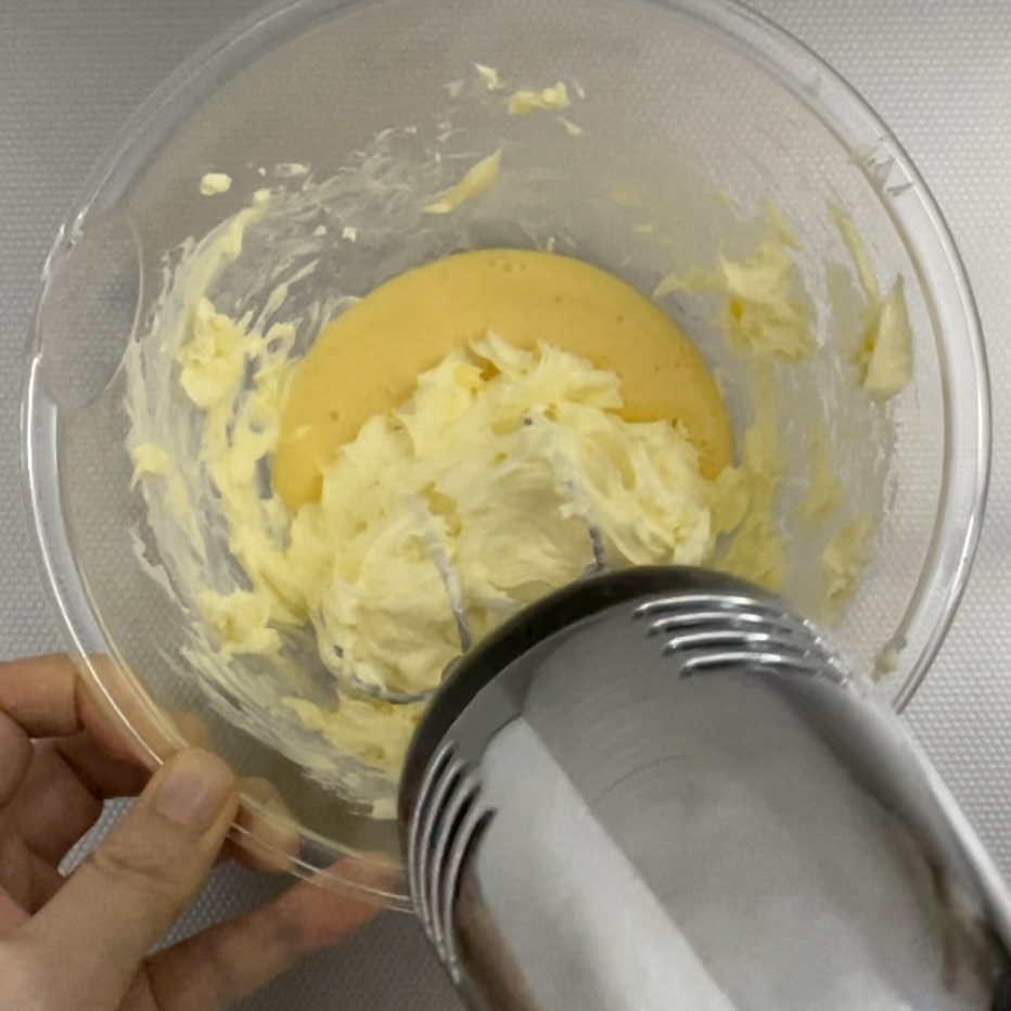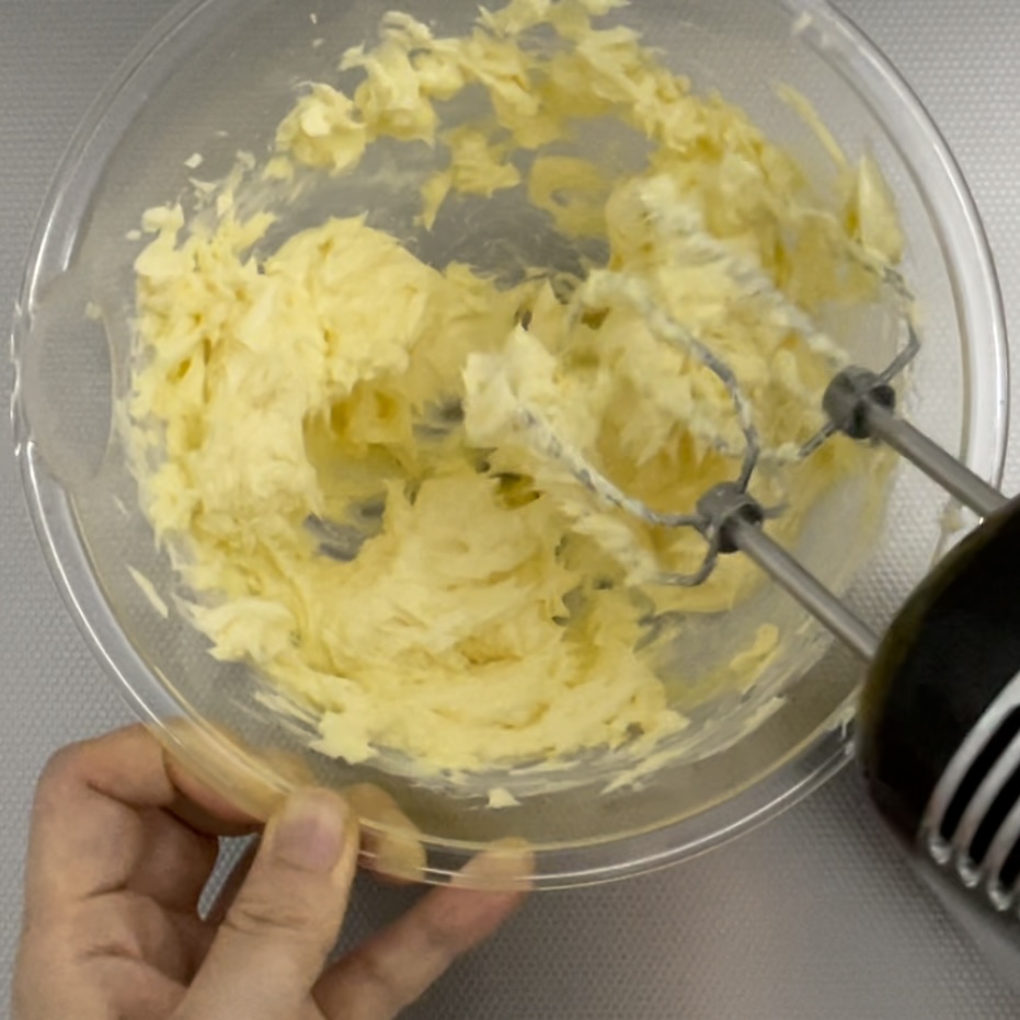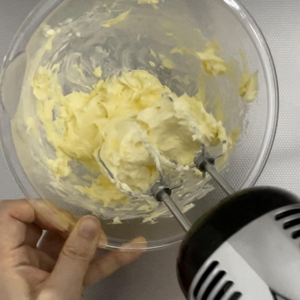 別のボウルで室温のバターをハンドミキサーの低速で混ぜ、なめらかで均一な状態にします。