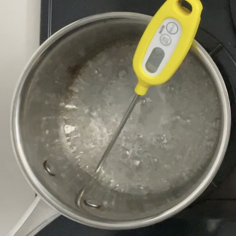 ①の鍋を火にかけ、最終的にシロップの温度を117~120℃にします。