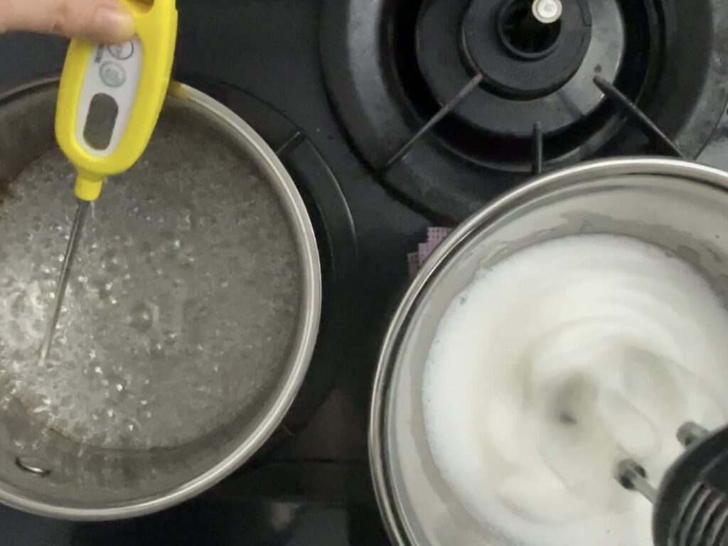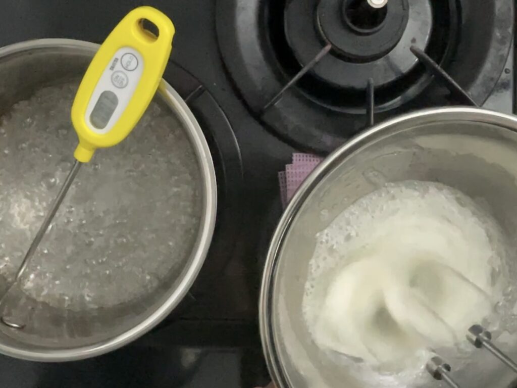 ③シロップが沸騰したぐらいで、卵白と砂糖を泡立て始めます。