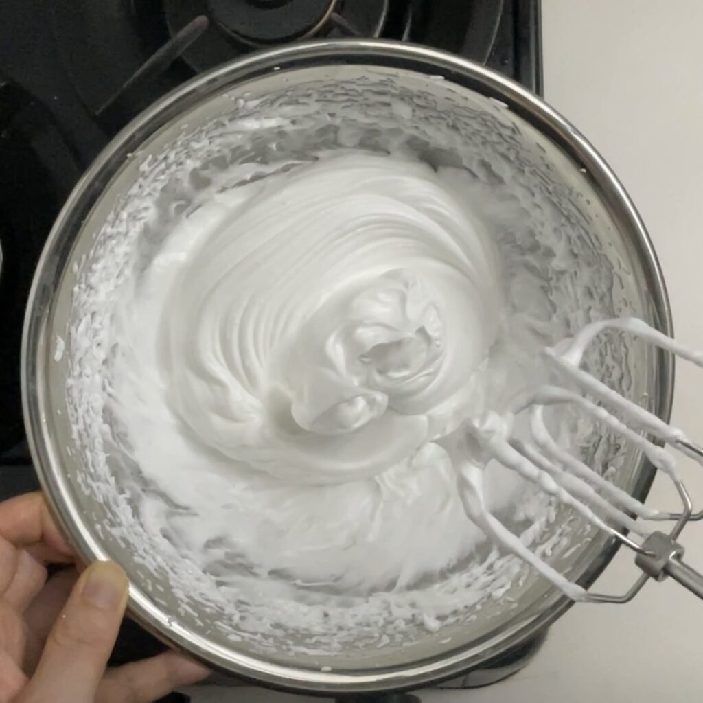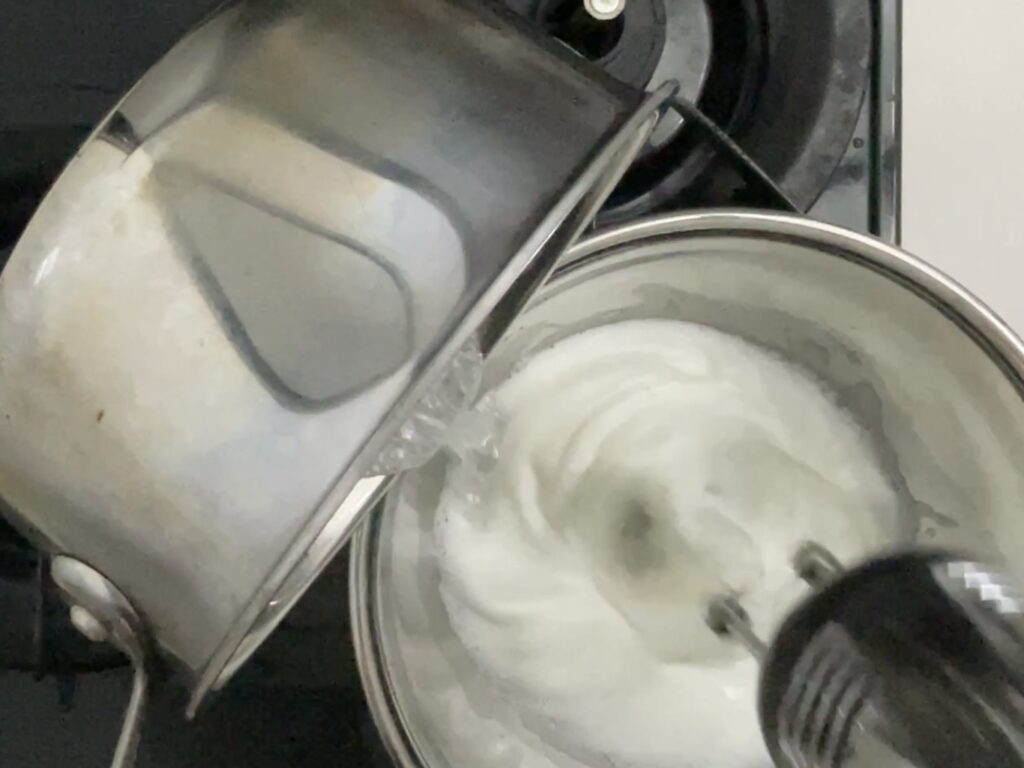 イタリアンメレンゲは卓上ミキサー(キッチンエイドなど)がないと、ハンドミキサーで一人でするにはかなり難易度が高いです。