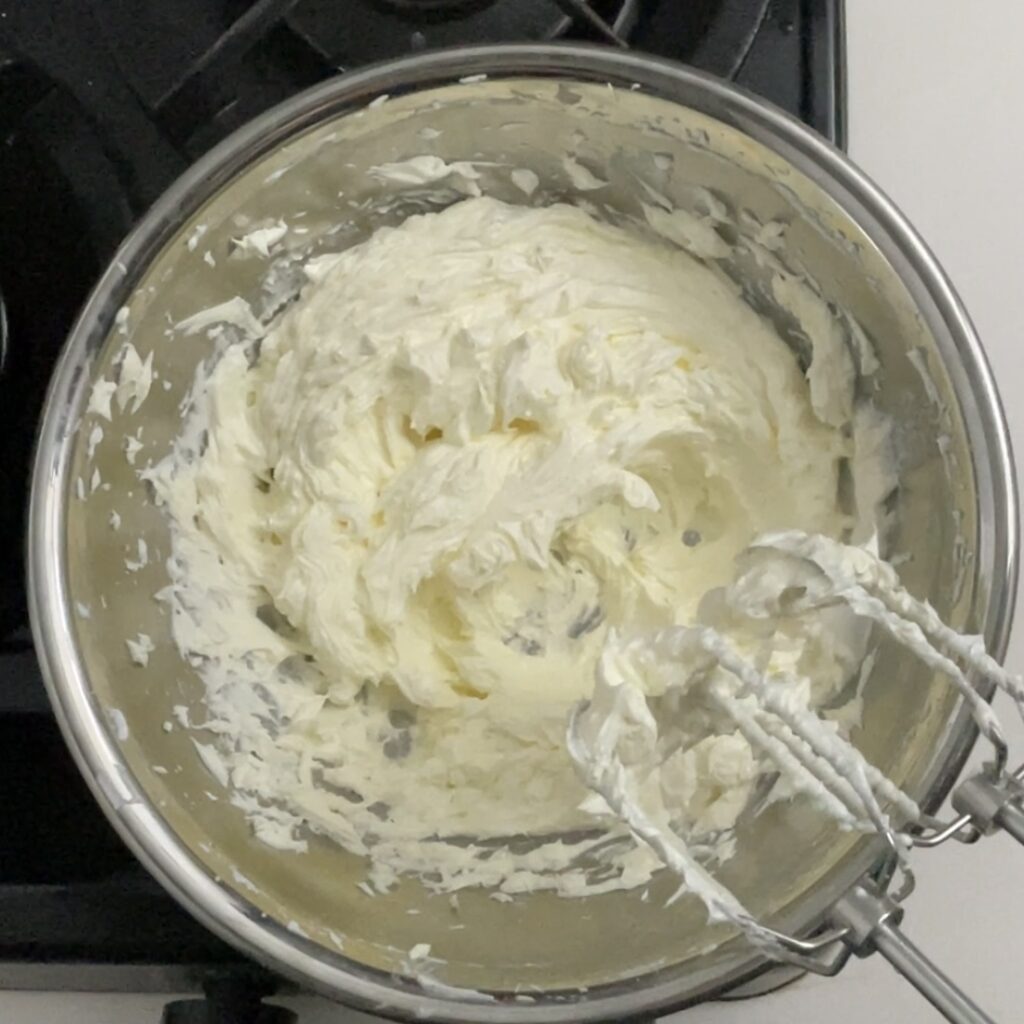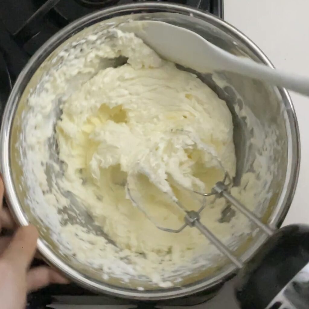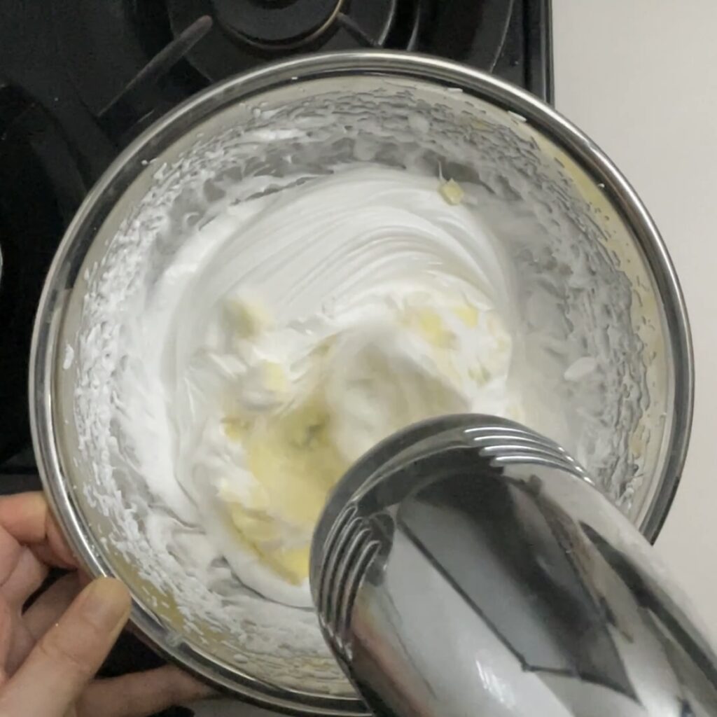 バターを入れたら、ハンドミキサーの中速で泡立てるように混ぜ合わせます。
