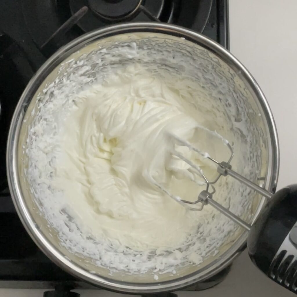 ハンドミキサーを止めた状態で入れてしまうとシロップが一箇所に固まってしまい、高速で回しながら入れると飛び散ってしまいます。