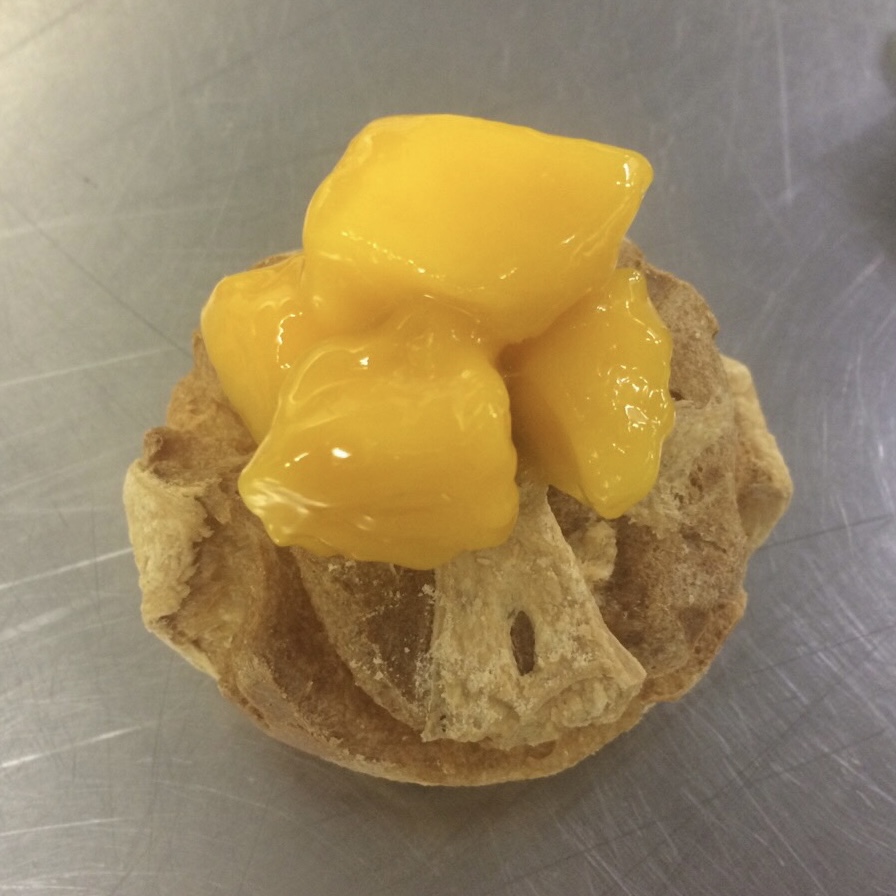 てっぺんに穴を開けてクリームを入れ、穴を隠すようにマンゴーを乗せたもの。