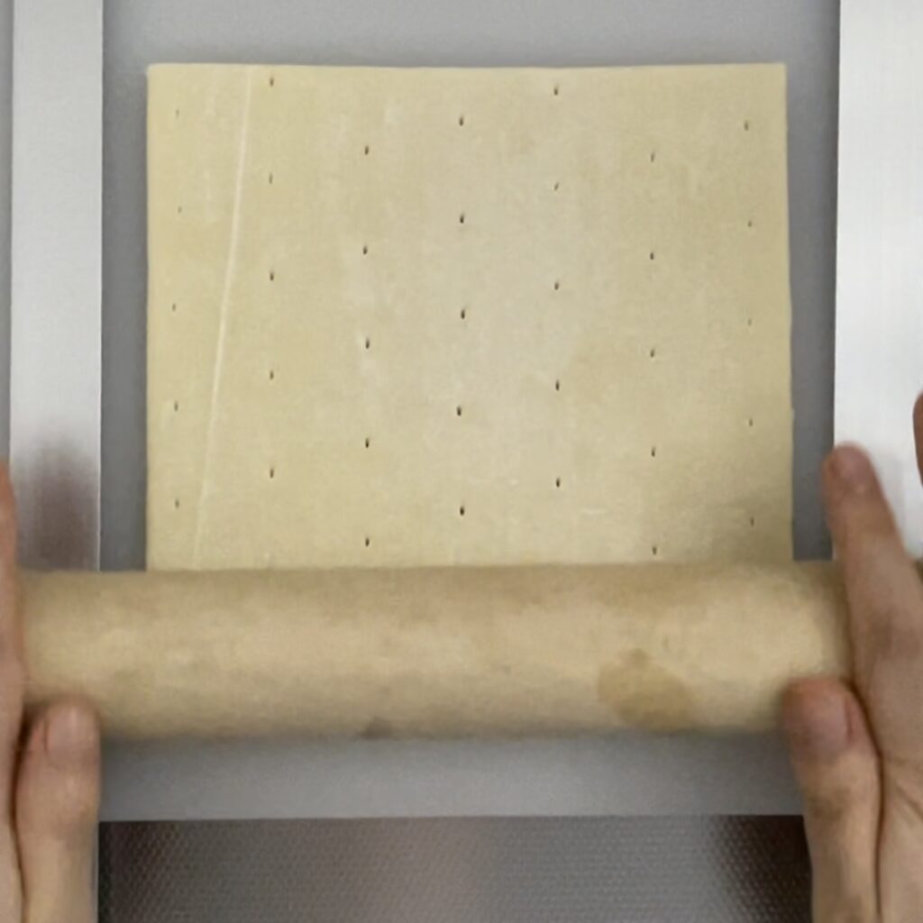 ①解凍したパイシートを2〜3mm厚に伸ばします。