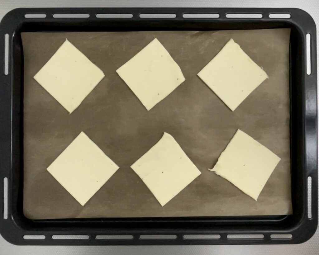 天板にオーブンシートを敷き、カットしたパイシートを並べます。