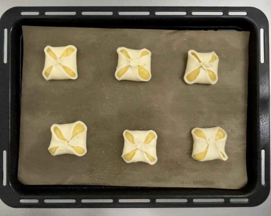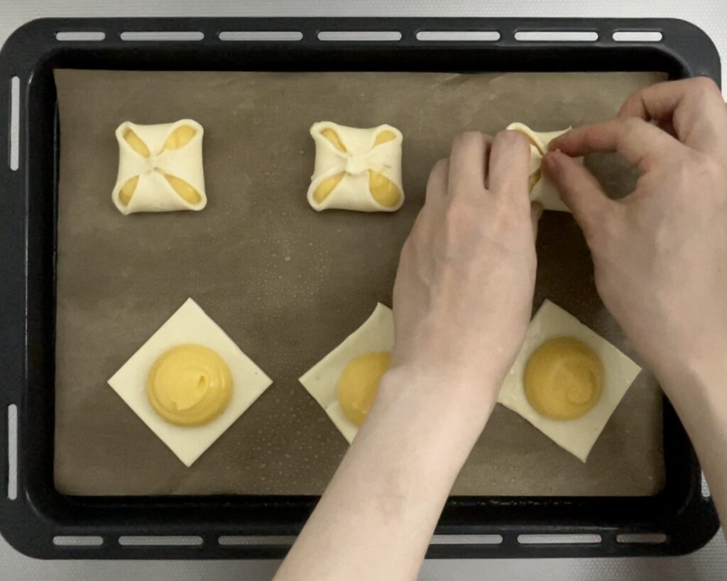 ⑥パイ生地の4つの角を集めてシュー生地を包みます。