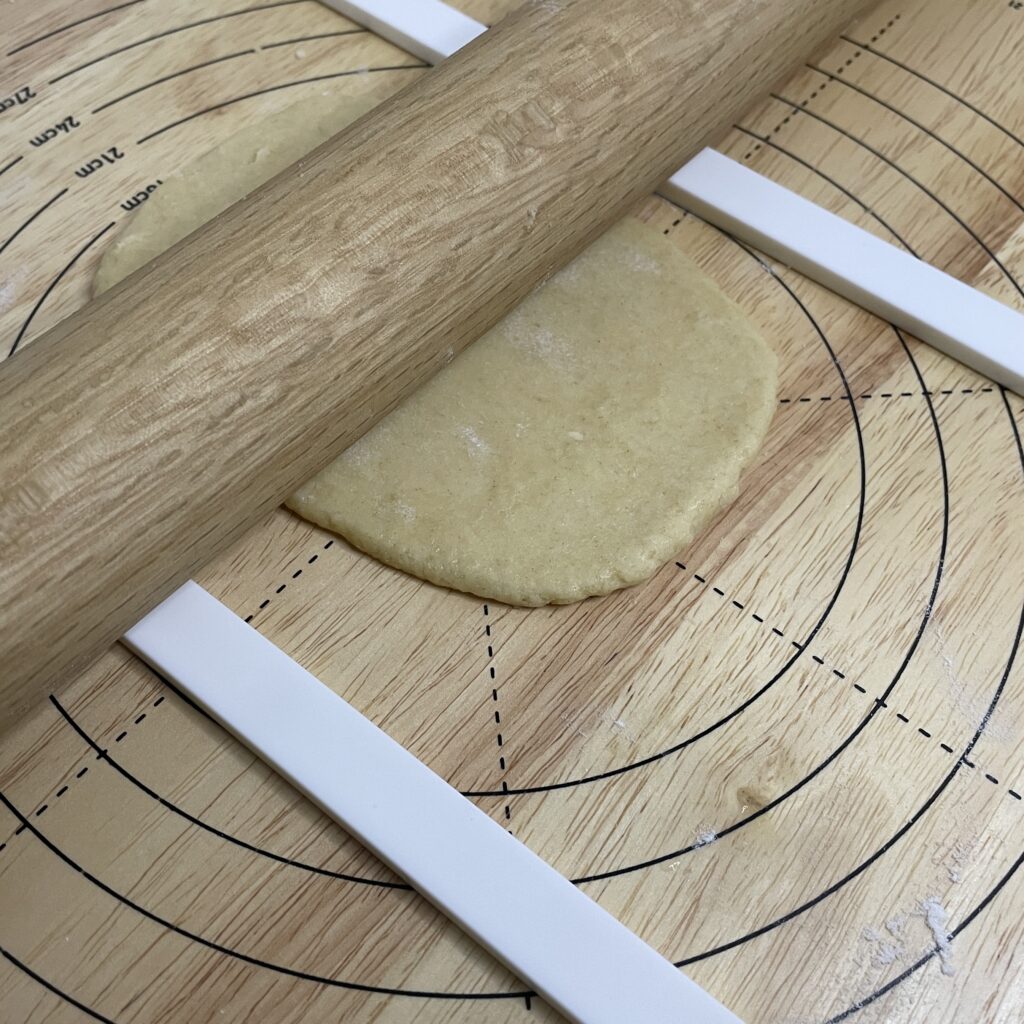 生地の両サイドにルーラーを置き、その上を麺棒で伸ばせば均等な厚さに伸ばせます。