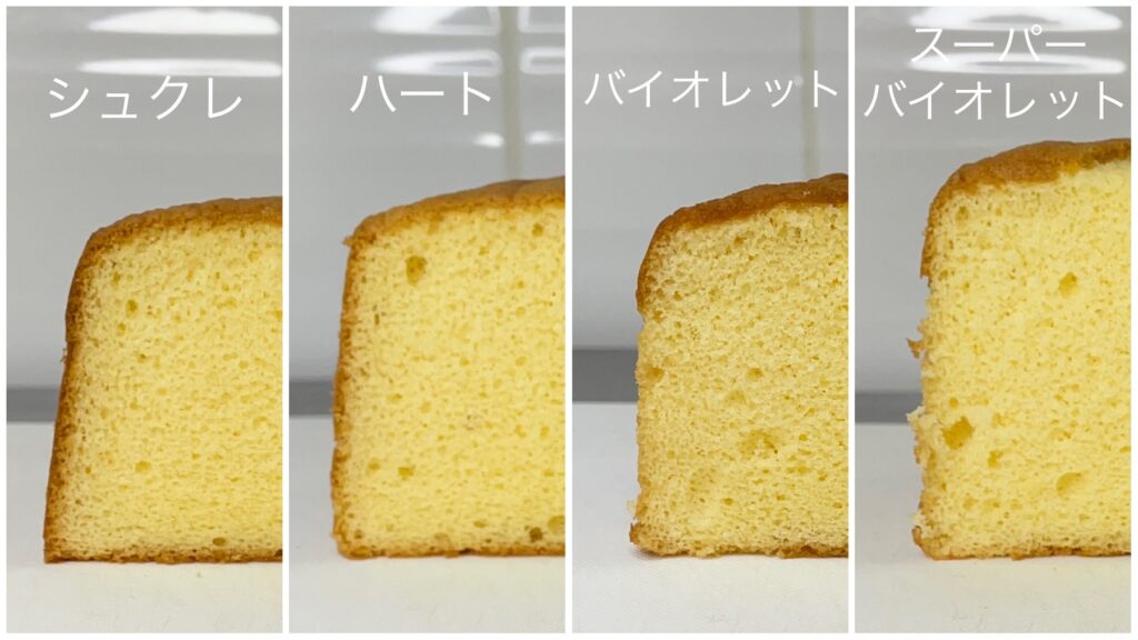 違う銘柄の薄力粉を使うとジェノワーズの仕上がりにどれぐらい影響が出るのかを、同じレシピで作り比べて検証しました。使った薄力粉は「シュクレ」「ハート」「バイオレット」「スーパーバイオレット」です。 -