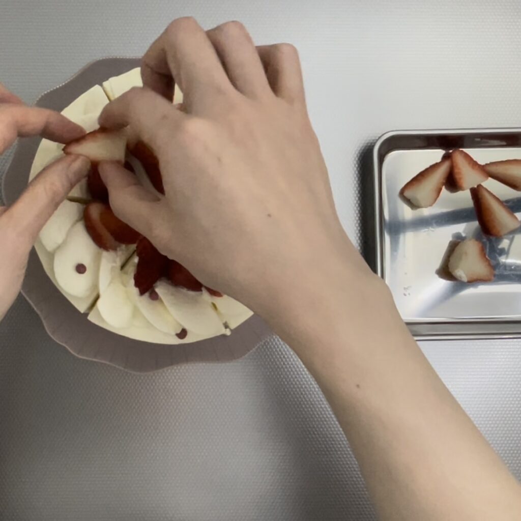 印の線を隠すようにヘタをとったいちご・半割のいちごを並べます。